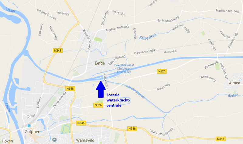 Hieronder de geplande locatie van de turbine aan het einde van het Afleidingskanaal in kaart.