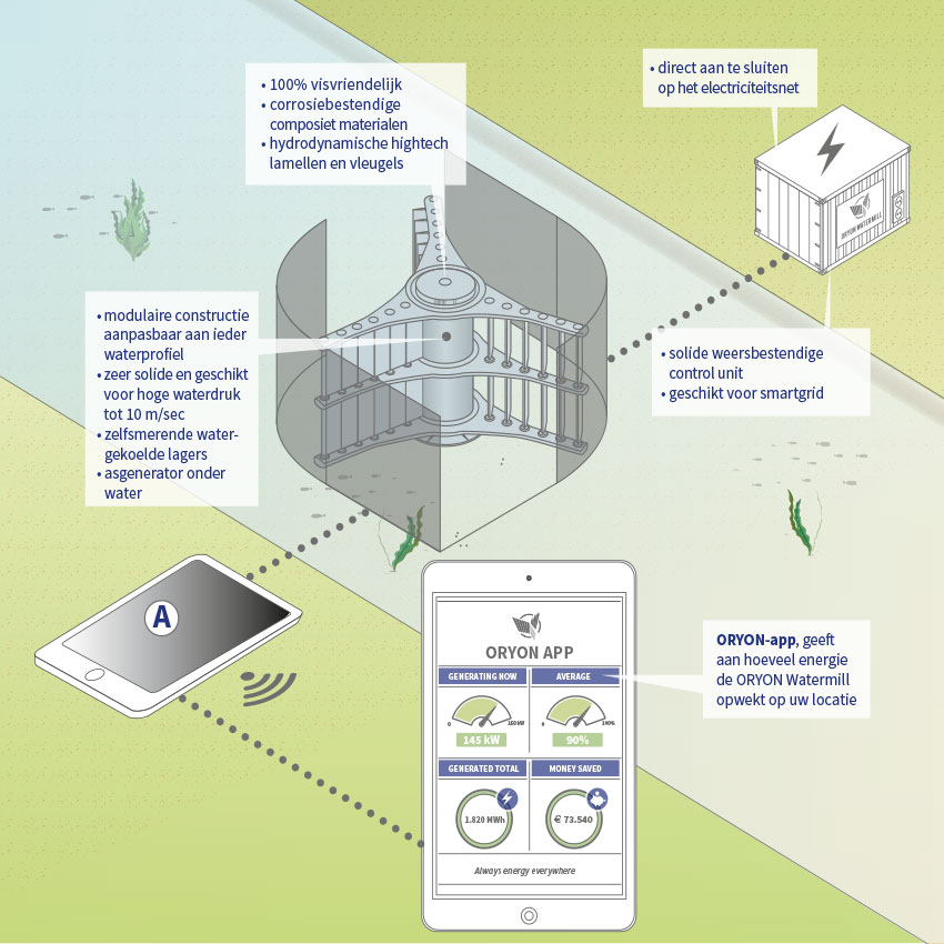 De gekozen turbines van Oryon Watermill zijn vis-vriendelijk en bevinden zich geheel onder water. Zie ook het filmpje hieronder: