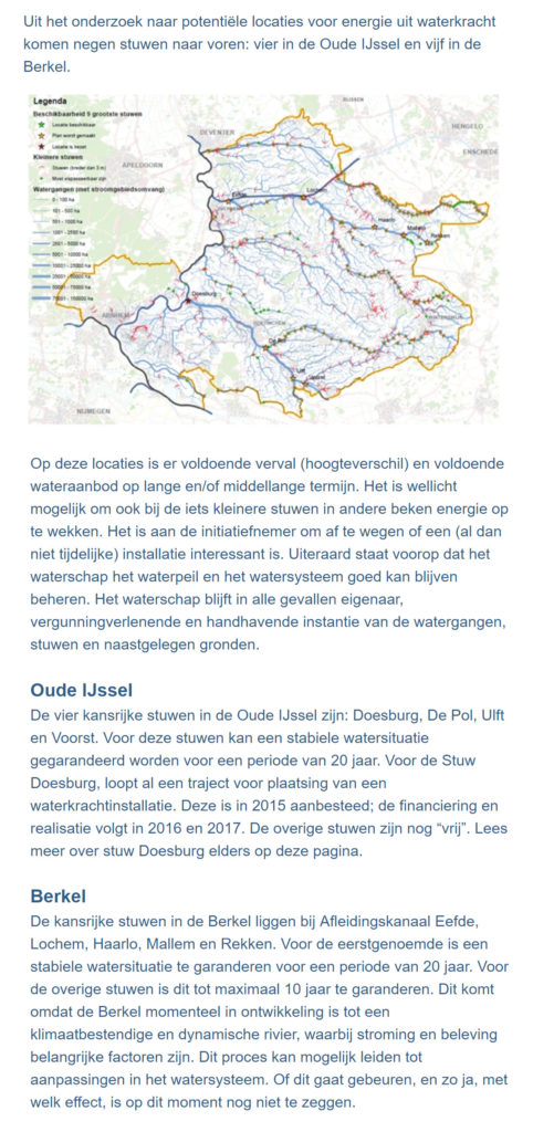 Voor de Berkel komen daar 5 stuwen voor in aanmerking die alle 5 opgepakt worden door de energiecoöperaties Lochem Energie en Berkelland Energie. Zie de artikelen hieronder.