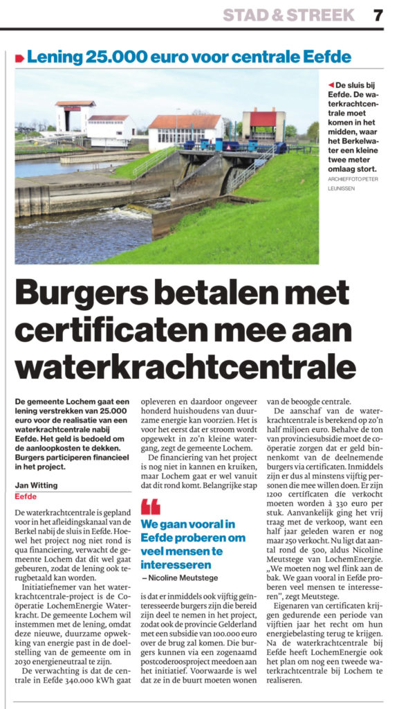 Tubantia: Het veelbelovende project van Lochem Energie om energie op te wekken met Berkel water in Eefde is helaas gestrand Lees verder