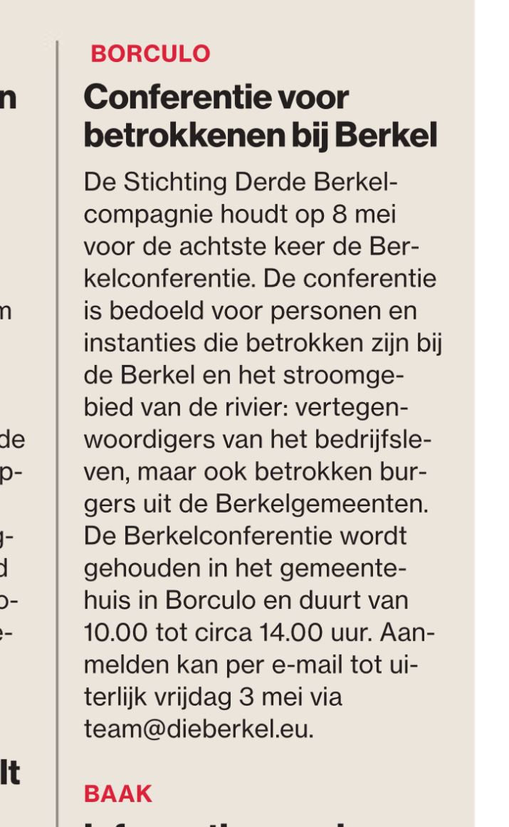 De Stentor veröffentlicht am 1. Mai ein Artikel über die nieuwe Berkelkonferenz am 8. Mai im Rathaus in Borculo wofür noch angemeldet werden kann bis am 3. Mai 2019.
