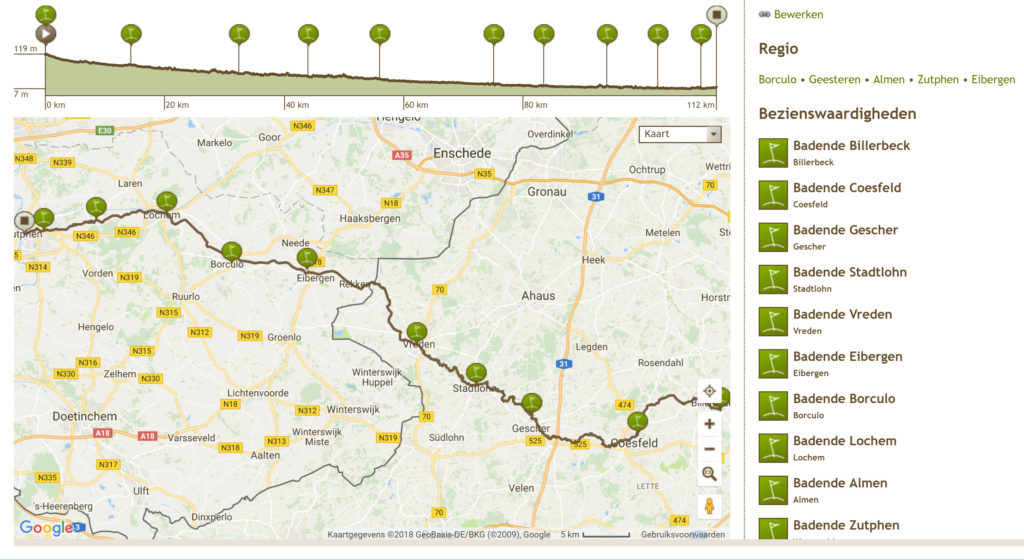 De afbeelding hieronder geeft de route weer met varianten langs andere Achterhoekse rivieren (klik de afbeelding voor een grotere kaart).